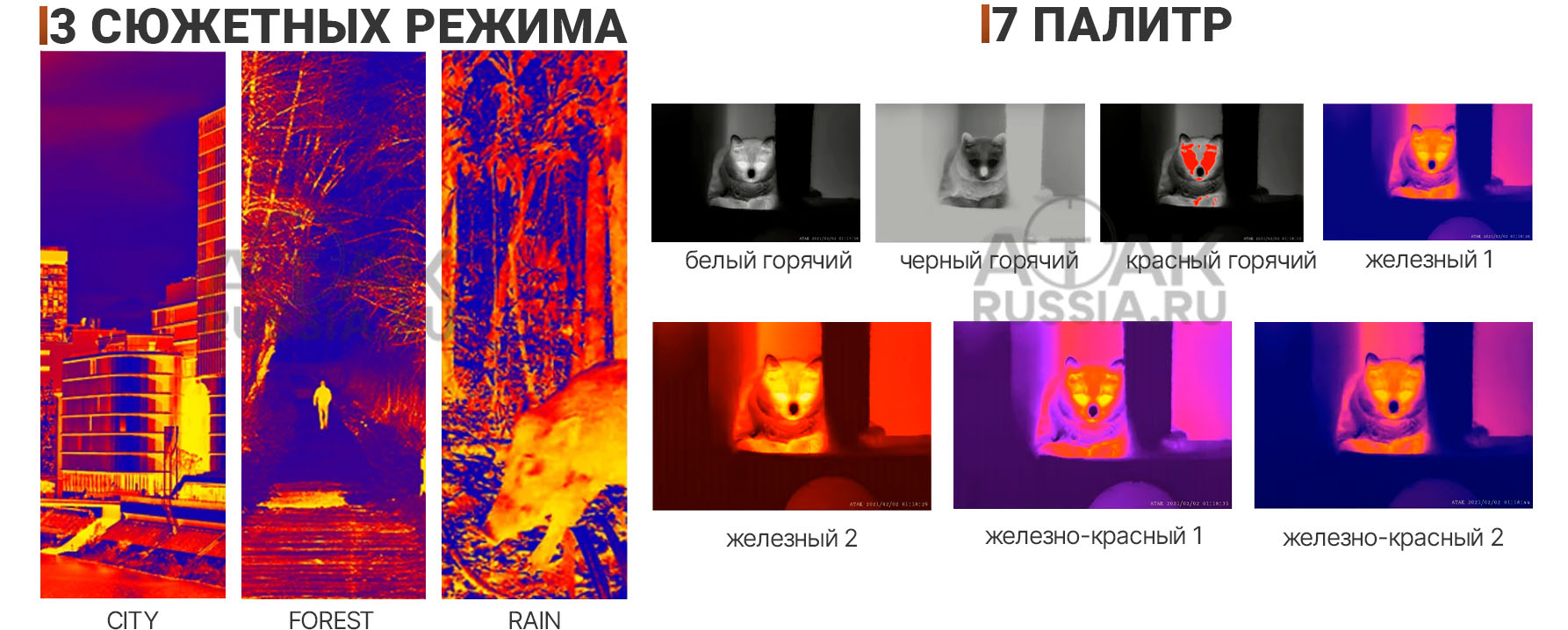 Тепловизор ATAK HT13-LRF предлагает три режима настройки изображения под разные условия среды: Город, Лес и Тропический лес.