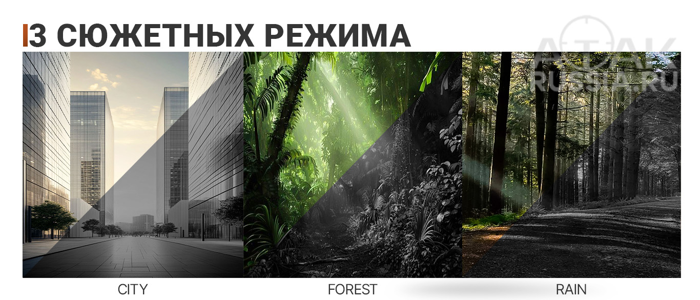 Режимы наблюдения — Город/Лес/Дождь - Быстрое переключение между тремя настроенными режимами работы позволяет адаптировать изображение под текущие условия. Например, режим «Город» эффективен в ситуациях с большими температурными перепадами между объектами.