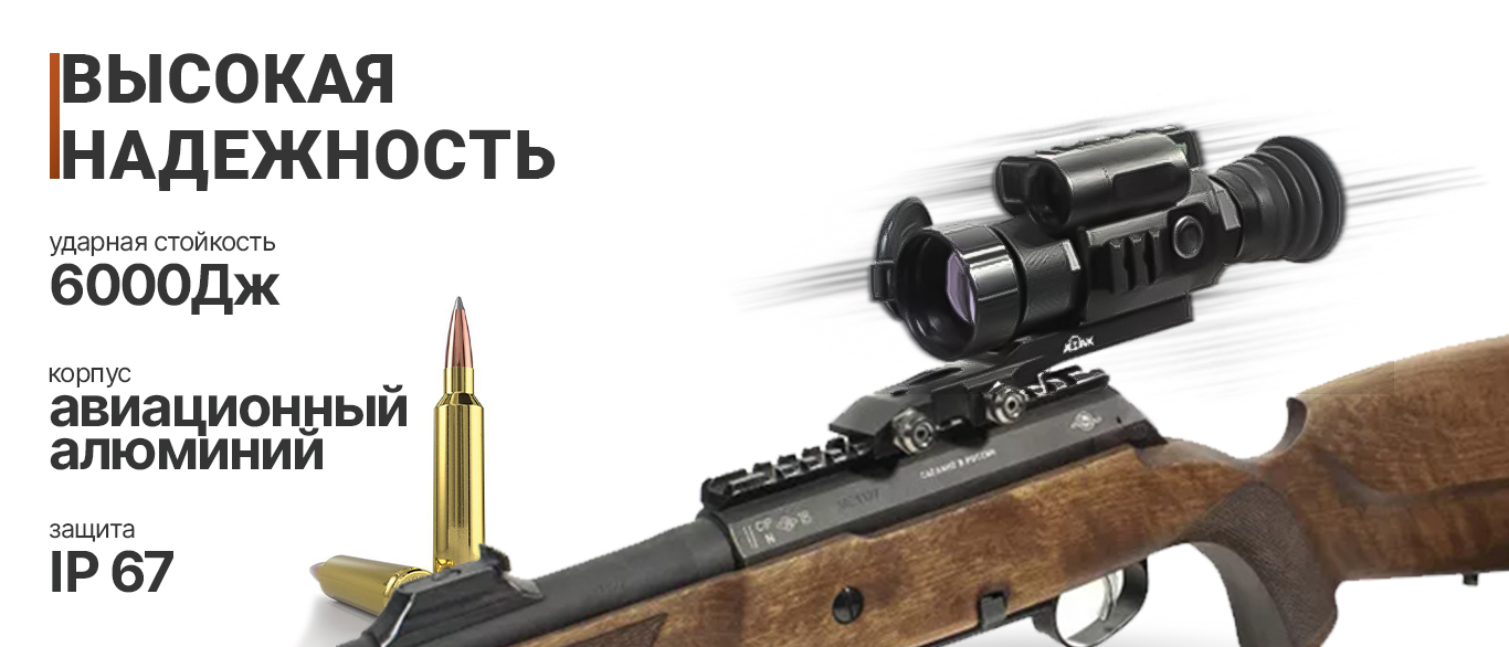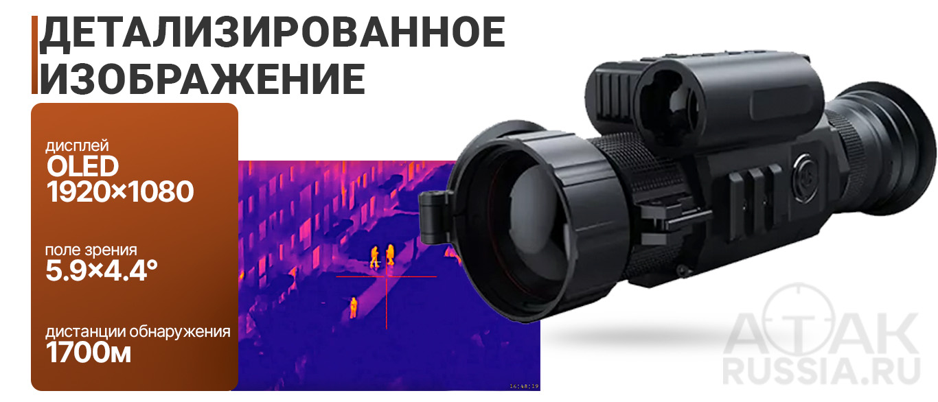 Корпус тепловизионного прицела выполнен из алюминиевого сплава, защита IP67 обеспечивает стойкость к дождю, пыли и кратковременному погружению в воду на глубину до 1 м. Рабочий диапазон температур составляет от -20 до +50°C.