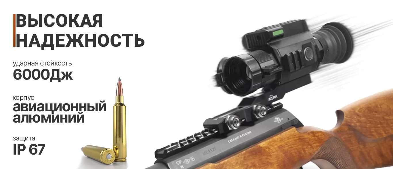 Корпус тепловизионного прицела выполнен из алюминиевого сплава, защита IP67 обеспечивает стойкость к дождю, пыли и кратковременному погружению в воду на глубину до 1 м. Рабочий диапазон температур составляет от -20 до +50°C.