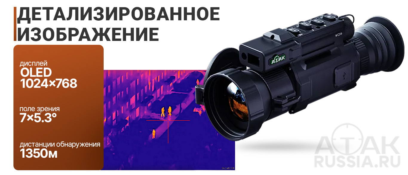 OLED-дисплей 1024×768 обеспечивает чёткую, стабильную картинку с правильной передачей тёмных тонов и хорошим различением слабых температурных контрастов. Цели легко выделяются даже в холодную и дождливую погоду.