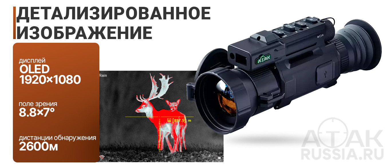 OLED-дисплей 1920x1080 обеспечивает чёткую, стабильную картинку с правильной передачей тёмных тонов и хорошим различением слабых температурных контрастов. Цели легко выделяются даже в холодную и дождливую погоду.