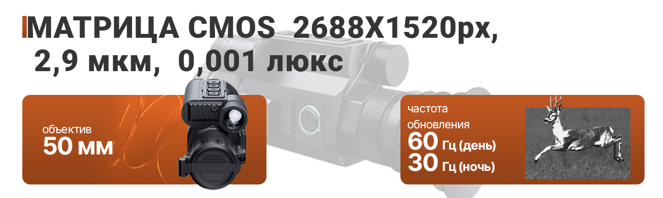 Цифровой прицел ATAK ES3 LRF оснащен матрицей 2688x1520px, 4 МП с размером пикселя 2,9 мкм и чувствительностью 0,001 люкс в сочетании с объективом диаметром 50 мм, что обеспечивает превосходное распознавание деталей даже при минимальных температурных различиях. Объектив с фокусным расстоянием 50 мм позволяет замечать самые незначительные изменения температуры даже в дождь и туман — в условиях, где большинство тепловизоров работают значительно хуже.