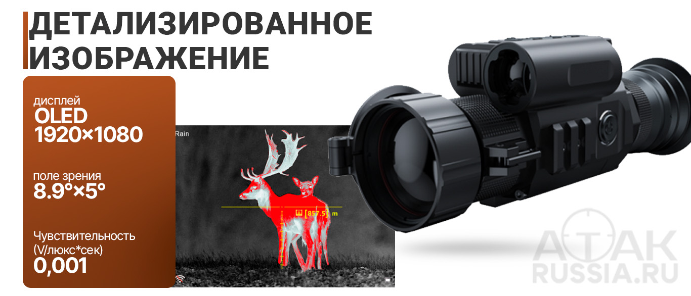 Благодаря цветному OLED-дисплею 1024x768px и передовой программе обработки сигнала АТАК DIPT качество изображения и эффективность работы превосходят устройства с матрицей 1080px, обеспечивая более точное распознавание объектов при слабом освещении и на значительных расстояниях.