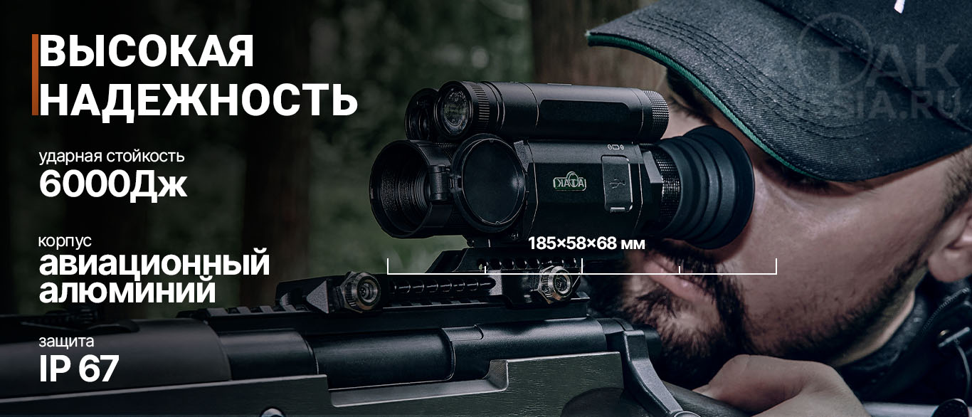Корпус цифрового прицела выполнен из алюминиевого сплава, защита IP67 обеспечивает стойкость к дождю, пыли и кратковременному погружению в воду на глубину до 1 м. Рабочий диапазон температур составляет от -20 до +50°C.